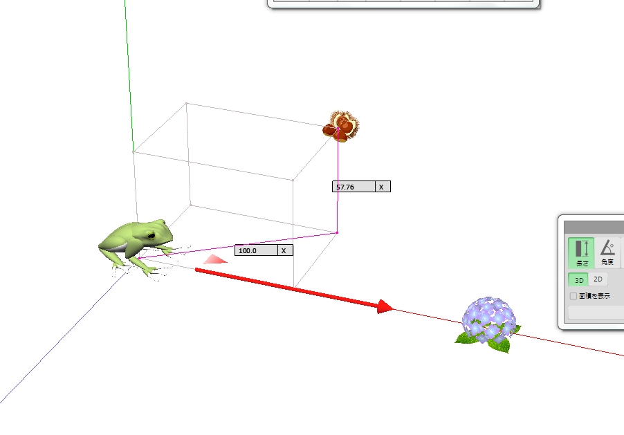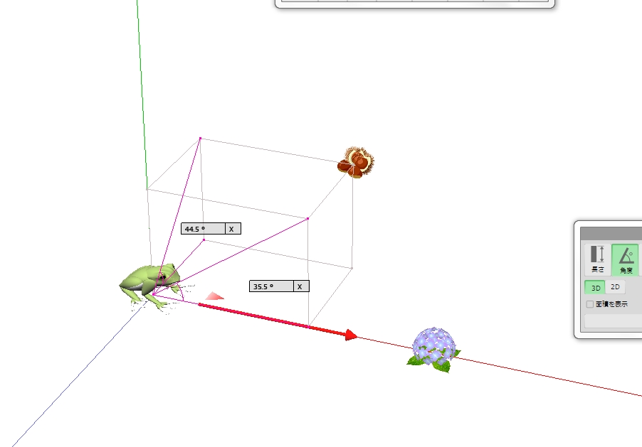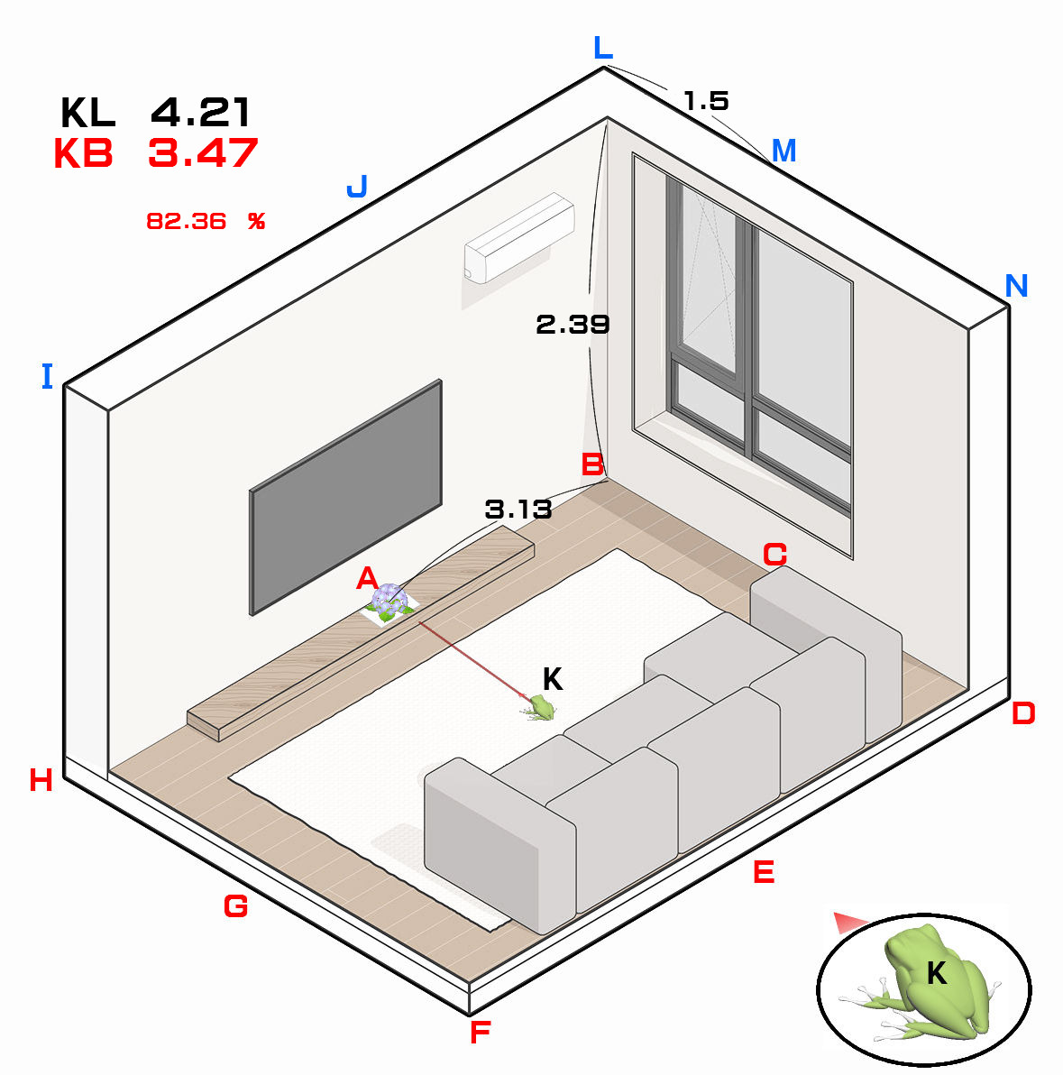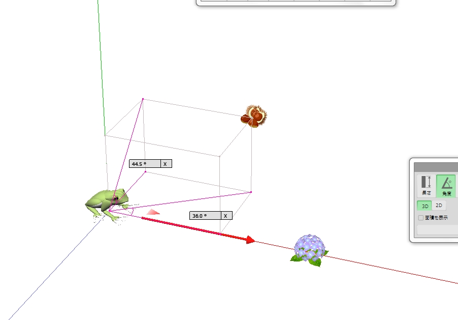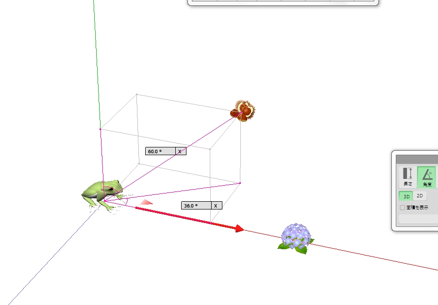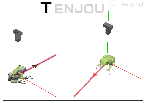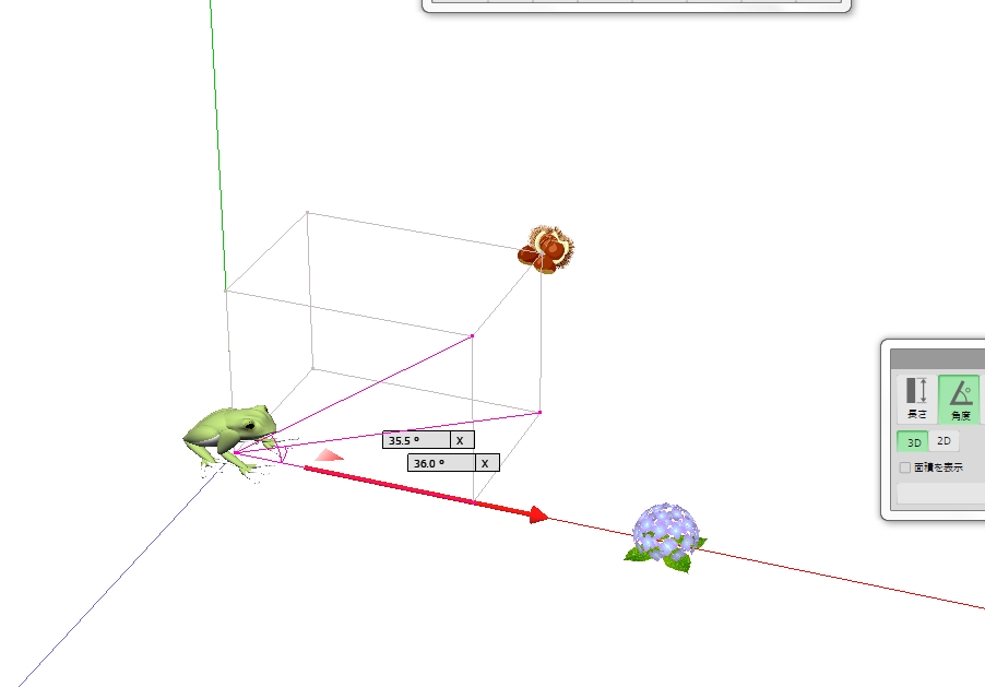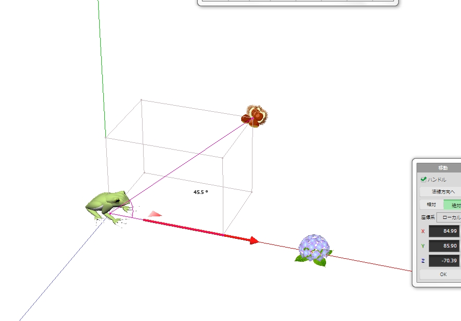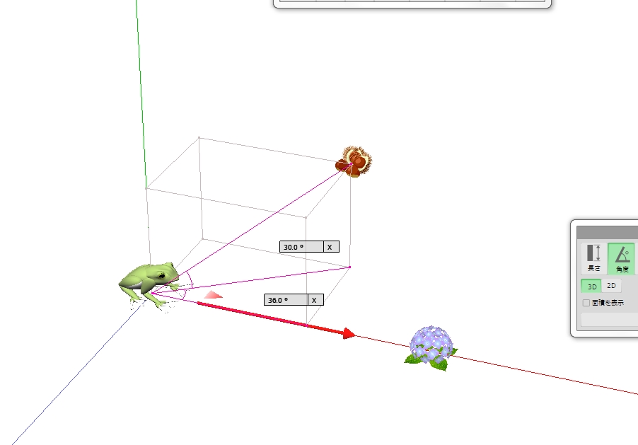 図 3つ → K が ( KAERU ) の げんてん K は フロア の ちゅうしん あじさい が ∠ 0 ど ほうこう へいめん は 赤 エリア りったいかく は ∠ 赤 K 青 みぎ の ふりむき は マイナス かいてん |