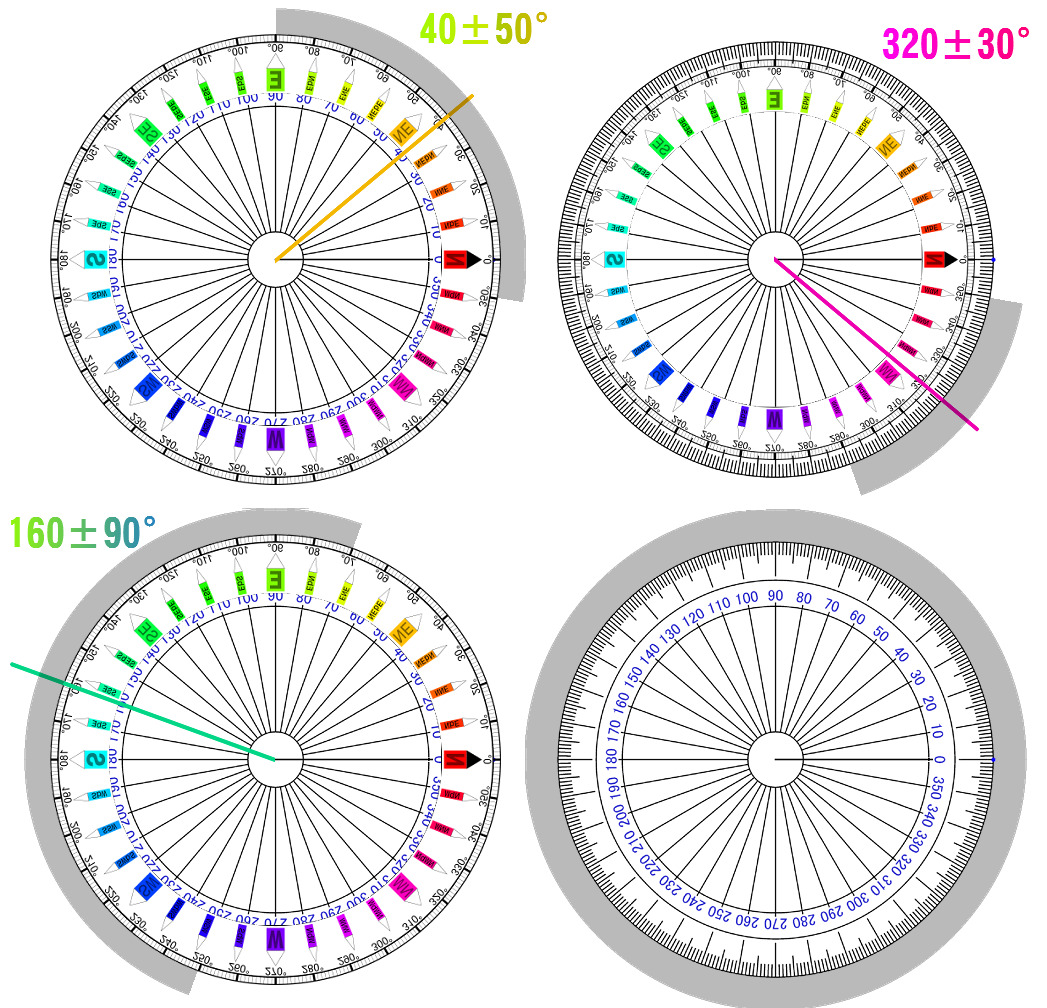 | たて ブレ ( y じくじげん への ブレ ) よこ ブレ ( z じくじげん への ブレ ) もげ ブレ ( w じくじげん への ブレ ) なんの じげんじく ( ふくすうのふくごう ) だったとしても、 けっきょく それら の じげん の えいきょう によって もくひょう 「 まと 」 に たいして ∠なんど ブレるのか … カクド 量 と カクド 位置 コンパス の あし の ひらきぐあい =: ∠ ブレ |