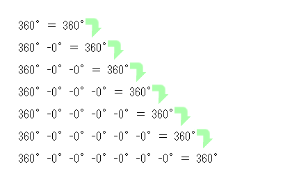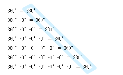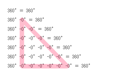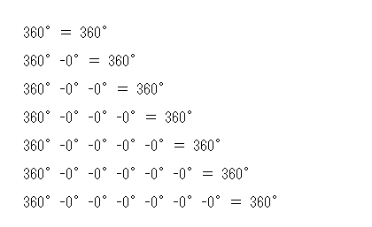 | 算数版の式 360°の ルイゲン 6 ÷ 2 = X なら ① わられる数(任意の数:例 6 ) を いったん 360 にする。。 ② カクド単位の 【 °(ど)】をつける ③ わる数 を 比率倍 する ④ カクド単位の 【 °(ど)】をつける 6 を 60 倍 したから 2 も 60 倍 する 360°÷ 120°= この方法で 3 がもとまる 6 ÷ 2 = 3 が、(この形式ではゼロ除算におうじられないので) 360°÷ 120°⇒ これを ルイゲン で あらわす 360°-120°-120°-120°= 0° -120°を【 3回 】おこなったから 360°÷ 120°= 3 もし 123.4 ÷ 30.85 なら ⇒ わられる数 を 360°に するために わる数 と わられる数を 2.917倍する 360°÷ 90°= X 360°-90°-90°-90°-90°= 0° -90°を【 4回 】おこなったから X = 4 算 数 版 の 式 この方法 を ゼロ除算につかってみる 6 ÷ 0 ⇒ 360°-0°(-0°-0°-0°…)= 360° = 0° あとは 【 回数 】の カウント方法 ( 上の表 ) の 主張する 【 説 】 によって その 答 がかわる |