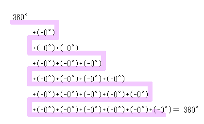 。。。。一般角 360°=: 一般角 0° 。。。。。 。(-1)² =: (-1)⁰ 。。..。パイラジアン=: 180° 。..。2 パイラジアン=: 0 パイラジアン 。。。。。。。i⁴ =: i⁰ |