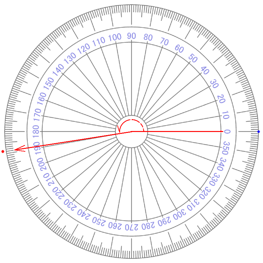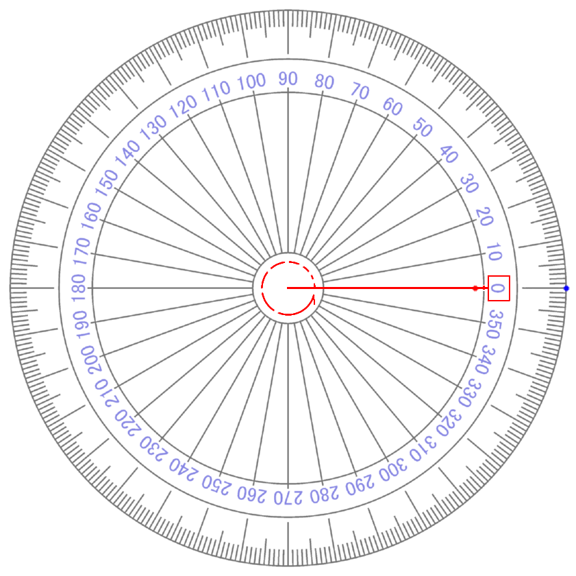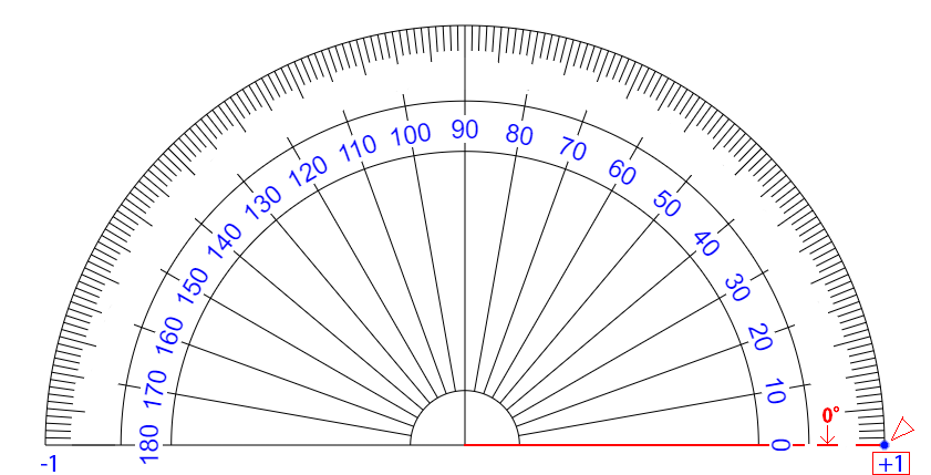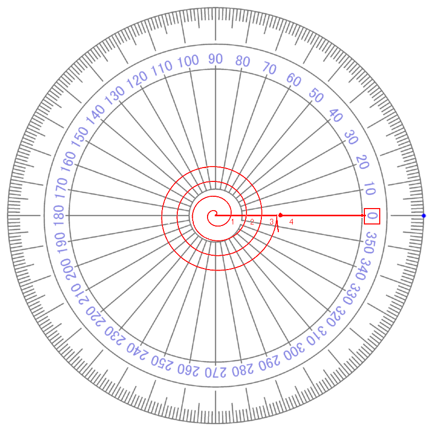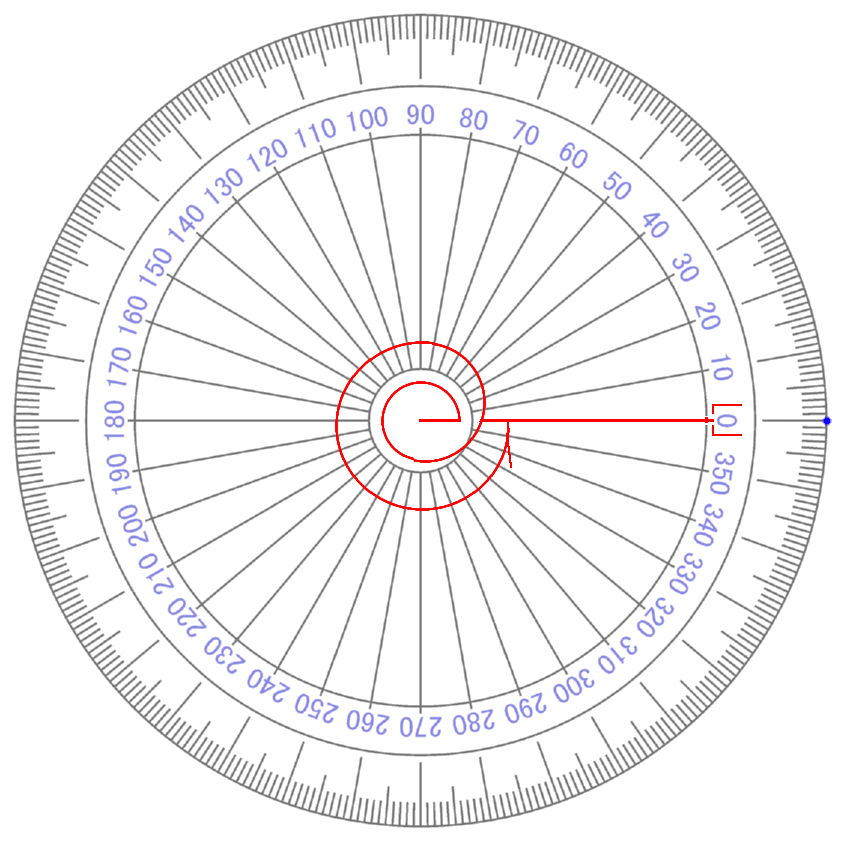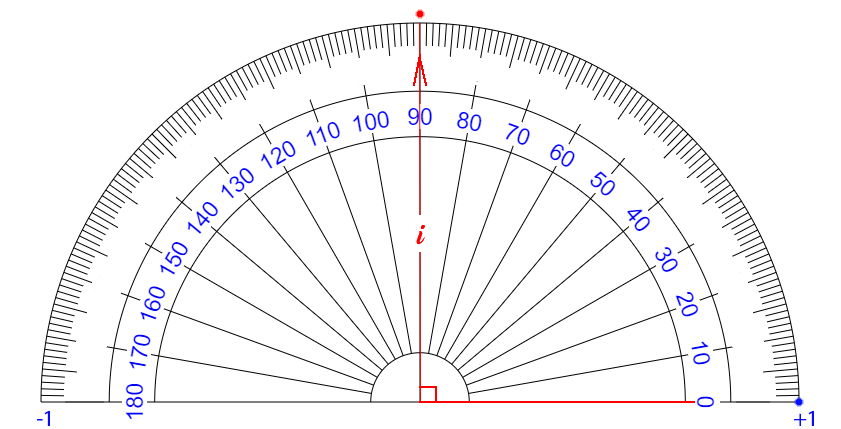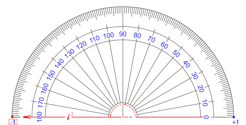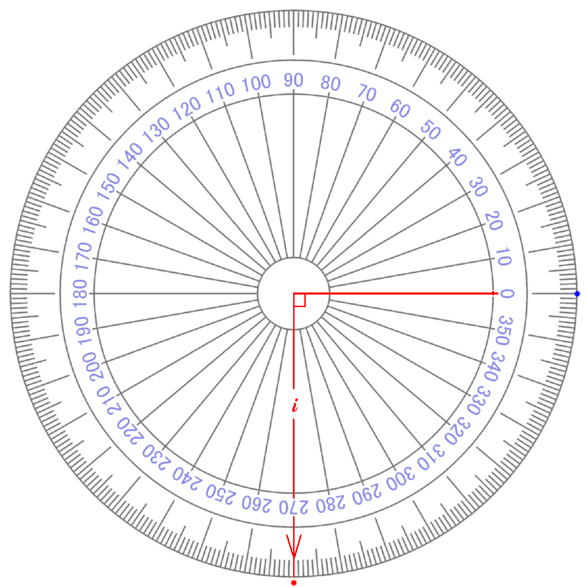 i 4 が ∠ 360° です 【 +1 】 という 【 量 】 が ゼロ の まわり を 半径 を たもったまま グルッ と 1周 し もとの おおきさ 【 +1 】 に もどってきたこと を イミ しています 【 ぎゃく回り ( i 0~マイナス 4 ) だった 場合 】 (マイナス かくど になる) |