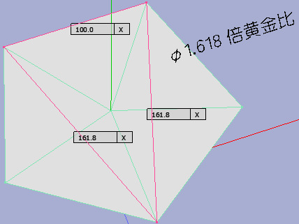 ┌ 0.4 じょう( 36 ど) → 80.901.. % └ 0.8 じょう( 72 ど) → 30.901.. % ぴったり 50 .. % 差 ばい に すると … (0.809..) × 2 = 1.618.. (おうごんひ) ばい に して +1 を たすと … (0.309..) × 2 + 1 = 1.618..(おうごんひ) |