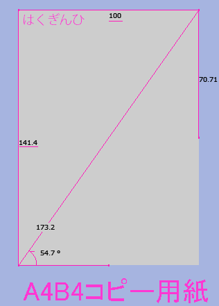 | 【 はくぎんひ 】:≫クリック A4・B4 など の コピー用紙 ルート2…(または+1)= ルート2(ひとよひとよ..) └ cos 45ど とか または↑に(+1)をしたもの。。。→ 半 分 に おっても おっても … そうじ (拡 縮) が くりかえされる 図 形 …(比 率) |