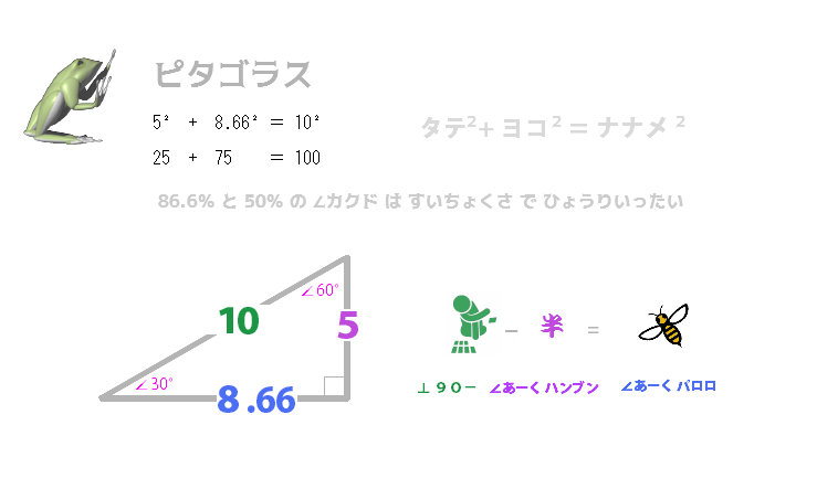 。。。 | ←1 は なんびゃく じょう してもゆるがない (60ど)の ばい ←0.7010 (ナレナイゼ45ど)の ばい ≫ 白銀比 ←0.8660 (パロロ30ど)の ばい ≫ 白金比(プラチナ比) ←1.414.. × 1.414.. = 2 ← 黄金比 との かんけい↓ したのひょう ←√2(ひとよ)×√3(ひとなみ) ←√2(ひとよ)の ばい ←√3(ひとなみ)の^じじょう ←√ケタ アップ ていすう ex.√20=(ひとよ)×(とうさん) |