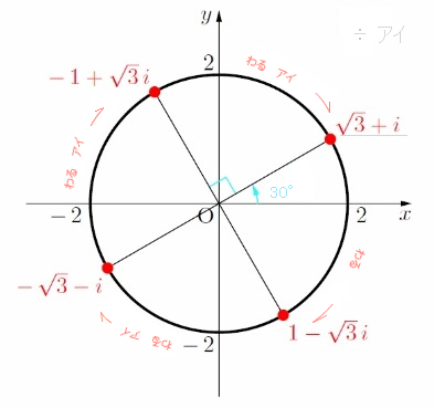 12 回かけると 1になるかず ω と その るいじょうほか 11こ …30° 2 回かけると 1になるかず -1 …180° 3 回かけると 1になるかず ω ω …120° 4 回かけると 1になるかず i -i -1 …90° |