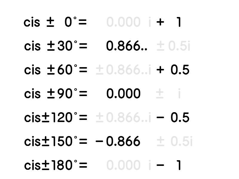 | カケザン左回転 ワリザン右回転 45deg arg ( 3 + 3i ) = 45° 30 deg arg ( 173.2 + 100i ) = yaku 30° arg ( √3 + i ) = 30°just arg ( (√3) * 100 + 100i ) = 30°just arg ( 866 + 50i ) = 30.0007° arg ( 0.866 + 0.5i ) = 30.0007° みやすく へんしゅう 四捨五入 版 ↑0.0007°などの ごさ を すっきりみせる arg(0.5i+0.866) https://ja.wolframalpha.com/input?i=round%28degrees%28arg%280.5i%2B0.866%29%29%2C0.01%29 arg((0.5i+0.866)^2) https://ja.wolframalpha.com/input?i=round%28degrees%28arg%28%280.5i%2B0.866%29%5E2%29%29%2C0.1%29 arg((0.5i+0.866)^3) https://ja.wolframalpha.com/input?i=round%28degrees%28arg%28%280.5i%2B0.866%29%5E3%29%29%2C0.1%29 arg((0.5i+0.866)^4) https://ja.wolframalpha.com/input?i=round%28degrees%28arg%28%280.5i%2B0.866%29%5E4%29%29%2C0.1%29 arg((0.5i+0.866)^5) arg((0.5i+0.866)^6) arg((0.5i+0.866)^7) arg((0.5i+0.866)^8) arg((0.5i+0.866)^9) https://ja.wolframalpha.com/input?i=round%28degrees%28arg%28%280.5i%2B0.866%29%5E9%29%29%2C0.1%29 arg((0.5i+0.866)^10) https://ja.wolframalpha.com/input?i=round%28degrees%28arg%28%280.5i%2B0.866%29%5E10%29%29%2C0.1%29 arg((0.5i+0.866)^11) arg((0.5i+0.866)^12) https://ja.wolframalpha.com/input?i=round%28degrees%28arg%28%280.5i%2B0.866%29%5E12%29%29%2C0.1%29 arg((0.5i+0.866)^0) https://ja.wolframalpha.com/input?i=round%28degrees%28arg%28%280.5i%2B0.866%29%5E0%29%29%2C0.1%29 arg((0.5i+0.866)^1) arg((0.5i+0.866)^-1) https://ja.wolframalpha.com/input?i=round%28degrees%28arg%28%280.5i%2B0.866%29%5E-1%29%29%2C0.1%29 arg((0.5i+0.866)^-2) arg((0.5i+0.866)^-3) https://ja.wolframalpha.com/input?i=round%28degrees%28arg%28%280.5i%2B0.866%29%5E-3%29%29%2C0.1%29 じっさいに入力しているしき↓ round(degrees(arg((0.5i+0.866)^5)),0.1) ししゃごにゅう(ぶんどき単位(カクド(ふくそすう)^なんじょうしたか),ししゃごにゅうするケタのくらい) |