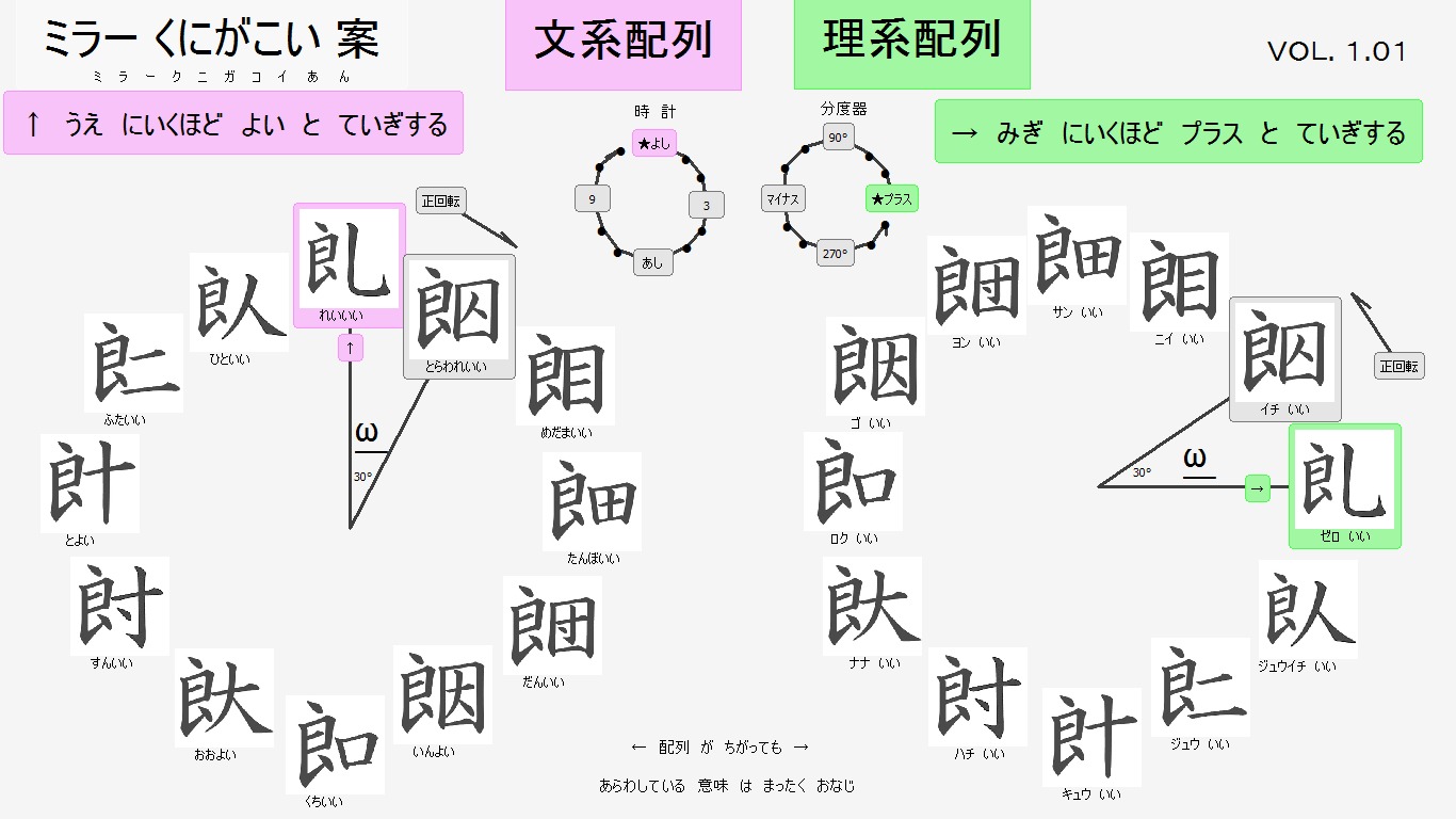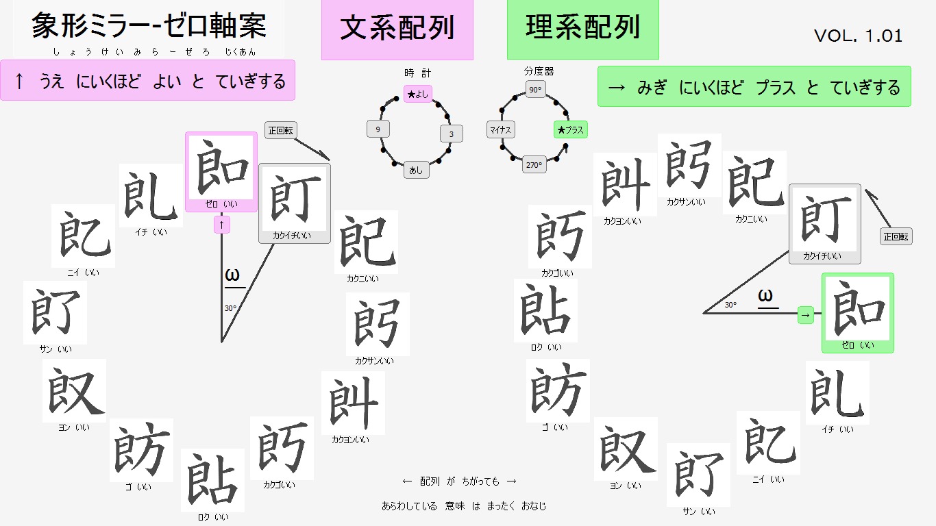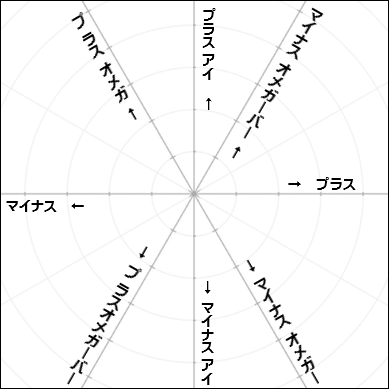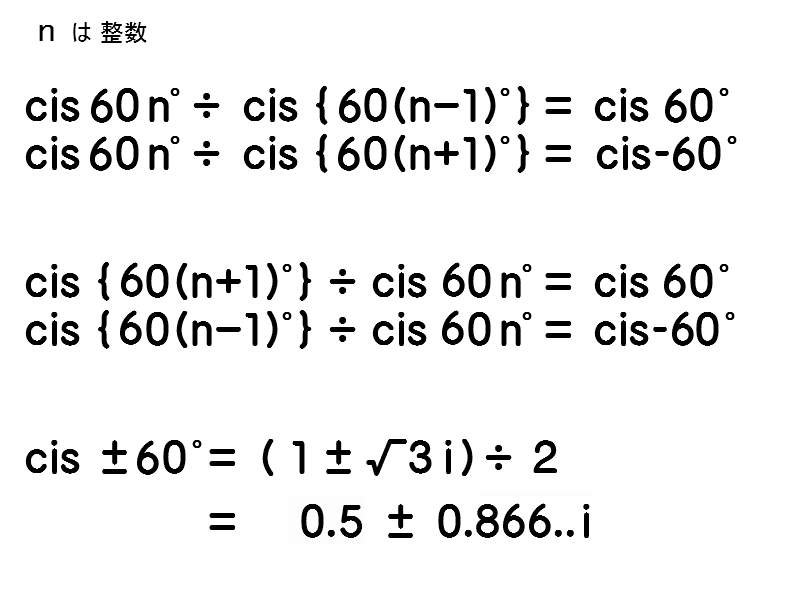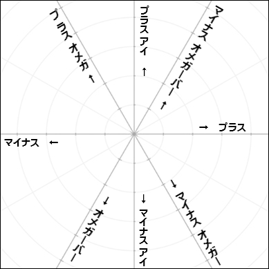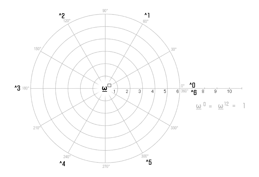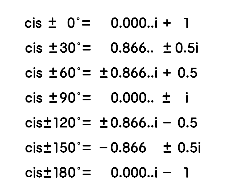 ![]() かけざんをさきにいれる ω 1 ÷ ω = ω 11 ≫ 1 ÷ ω 1 = ω 11 ≫ 1 ÷ ω 2 = ω 10 ≫ 1 ÷ ω 3 = ω 9 ≫ 1 ÷ ω 4 = ω 8 ≫ 1 ÷ ω 5 = ω 7 ≫ 1 ÷ ω 6 = ω 6 ≫ 1 ÷ ω 7 = ω 5 ≫ 1 ÷ ω 8 = ω 4 ≫ 1 ÷ ω 9 = ω 3 ≫ 1 ÷ ω 10 = ω 2 ≫ 1 ÷ ω 11 = ω 1 ≫ 1 ÷ ω 12 = ω 0 ≫ ---- 1 ÷ ω 0 = ω 0 ≫ 1 ÷ ω 0 = ω 12 ≫ ((-1 + sqrt3*i)/2) =: ω オメガ 120°回転 ((sqrt3 + i)/2) =: ω ハニーオメガ オメガほど回転力をもっていない 30°回転 |