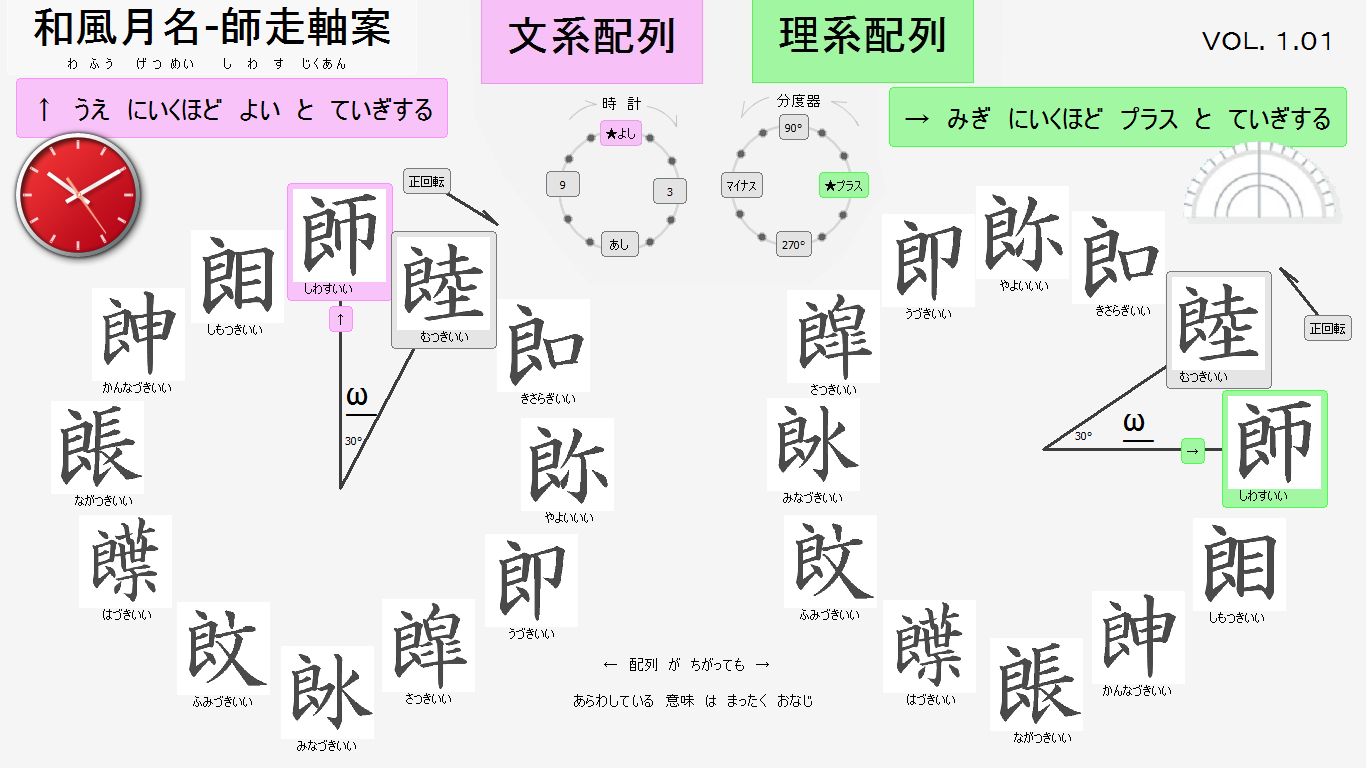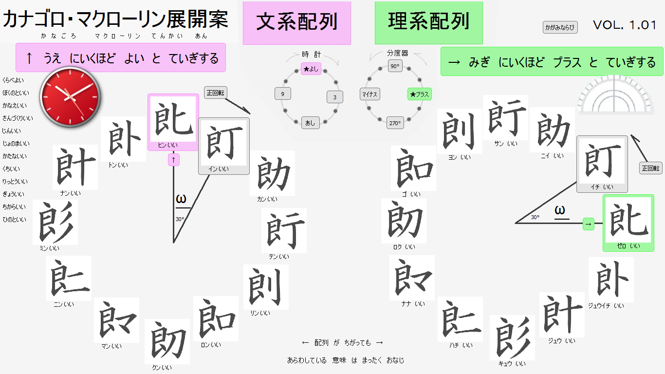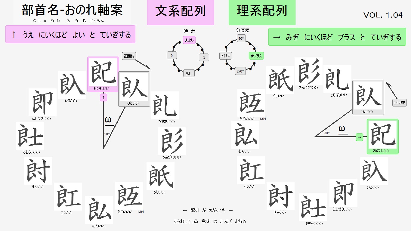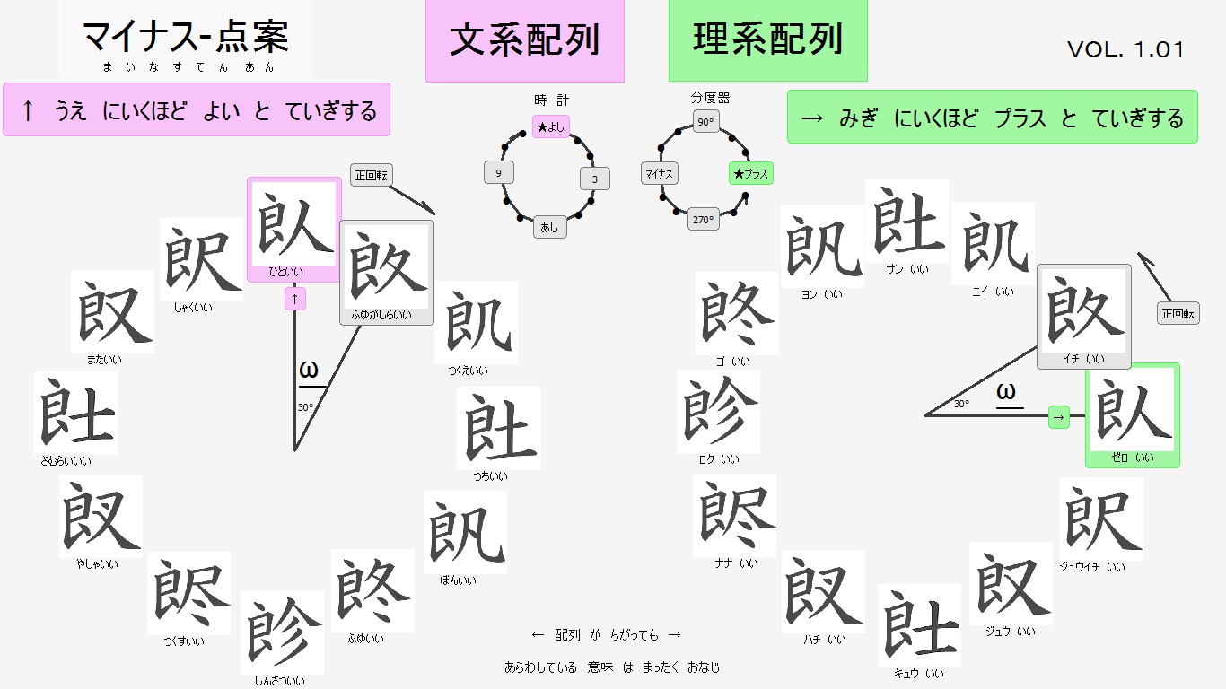![]() かけざんをさきにいれる ω 1 ÷ ω = ω 11 ≫ 1 ÷ ω 1 = ω 11 ≫ 1 ÷ ω 2 = ω 10 ≫ 1 ÷ ω 3 = ω 9 ≫ 1 ÷ ω 4 = ω 8 ≫ 1 ÷ ω 5 = ω 7 ≫ 1 ÷ ω 6 = ω 6 ≫ 1 ÷ ω 7 = ω 5 ≫ 1 ÷ ω 8 = ω 4 ≫ 1 ÷ ω 9 = ω 3 ≫ 1 ÷ ω 10 = ω 2 ≫ 1 ÷ ω 11 = ω 1 ≫ 1 ÷ ω 12 = ω 0 ≫ ---- 1 ÷ ω 0 = ω 0 ≫ 1 ÷ ω 0 = ω 12 ≫ ((-1 + sqrt3*i)/2) =: ω オメガ 120°回転 ((sqrt3 + i)/2) =: ω ハニーオメガ オメガほど回転力をもっていない 30°回転 |